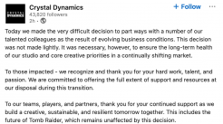 0Crystal Dynamics遭受第二波裁員的打擊 新聞. 作者為 Marcus Persson 2025年 08月 28日, 06:11 在今年早些時候進行第一輪裁員後,《古墓麗影》工作室現已確認了另一波裁員潮。